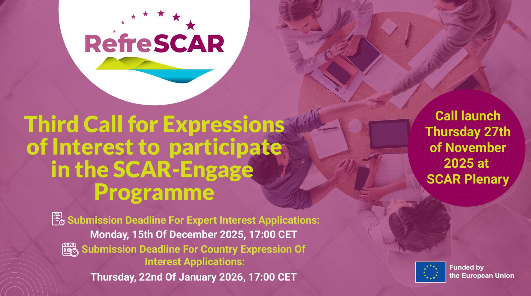 The SCAR-Engage 3rd Call for Expression of Interest is open! It supports newcomers to the SCAR Working Groups (WGs) and strengthens national visibility across the European R&I landscape.